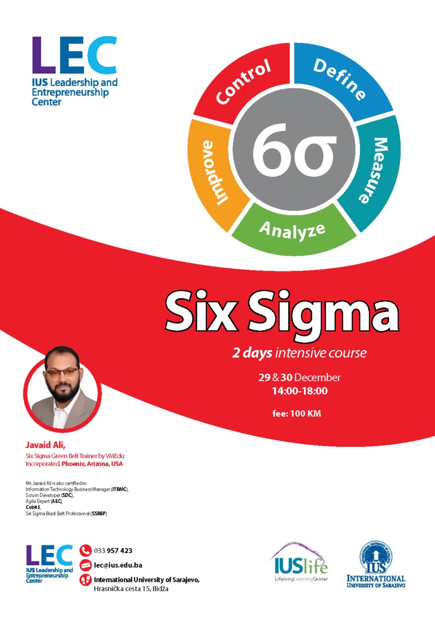 In cooperation with IUS Leadership and Enterpreneurship Center (LEC) IUS Life is organizing a two-day intensive course in Six Sigma with mr. Javaid Ali, Six Sigma green belt trainer from VMEdu Incorporated, Phoenix, USA.